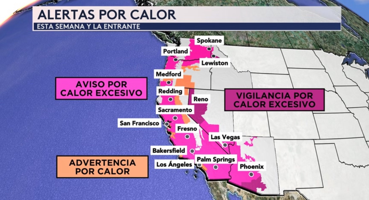 •También hay que estar pendiente de las temperaturas peligrosas para el oeste del país debido a una ola de calor prolongada que se extenderá hasta la próxima semana. Hay alertas por calor excesivo en vigor desde los estados de Arizona hasta Washington, lo que incluye prácticamente el estado entero de California
