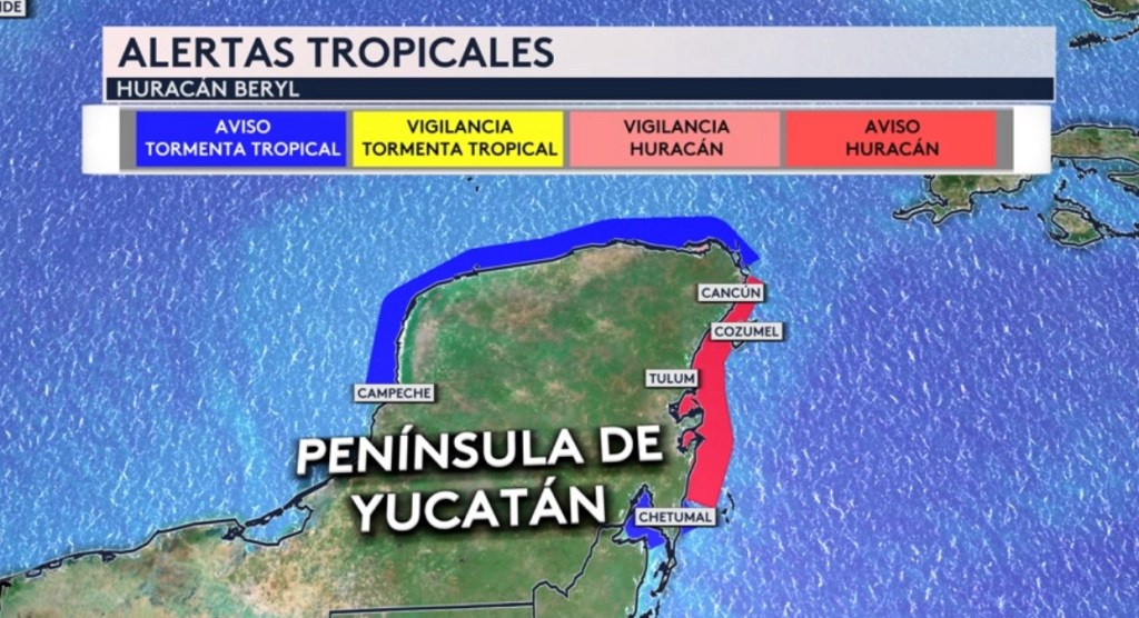 •Alertas tropicales todavía en vigor para la Península de Yucatán: un aviso de huracán que incluye las ciudades de Cancún, Cozumel, Playa del Carmen y Tulum y un aviso de tormenta tropical que incluye la ciudad de Campeche
