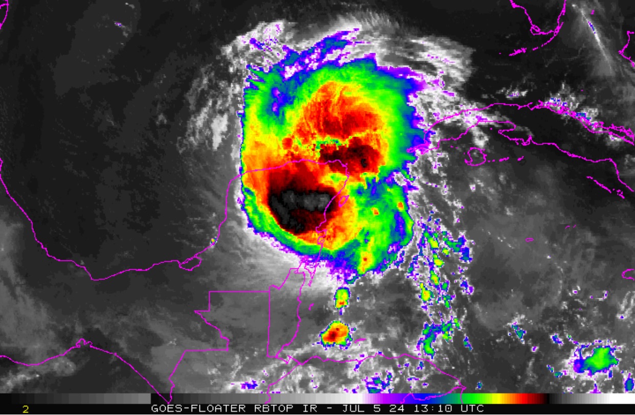 •El Huracán Beryl tocó tierra esta mañana a las 7:05 AM en la Península de Yucatán a unas 5 millas al noreste de la ciudad de Tulum en México como huracán de categoría 2 con vientos máximos sostenidos de 110 mph