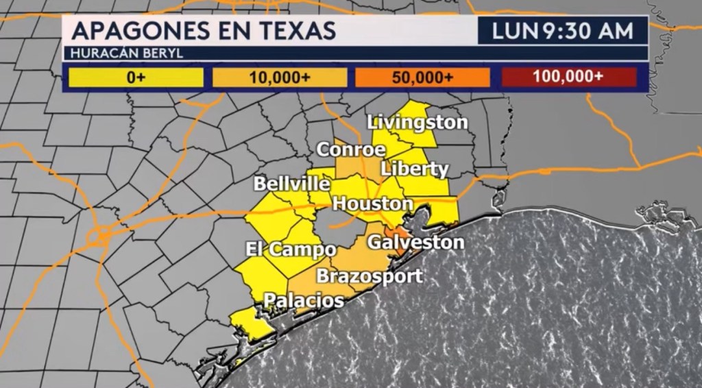 •Según el boletín más reciente de las 9:00 AM, el Beryl se mantiene como huracán con vientos máximos sostenidos de 75 mph. Se encuentra a unas 30 millas al suroeste de Houston mientras que su movimiento lo lleva al norte a 12 mph