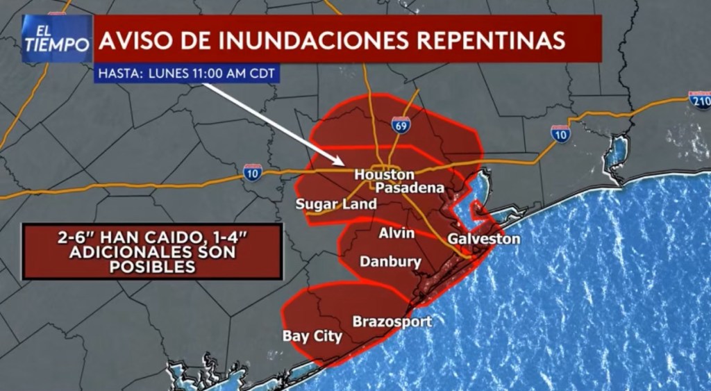 •Hay 3 avisos por inundaciones repentinas en vigor para el sureste de Texas hasta luego esta mañana. Entre 2 y 6” de lluvia han caído y se esperan 1-3” adicionales. Las ciudades afectadas son Houston, Galveston, Pasadena y Bay City