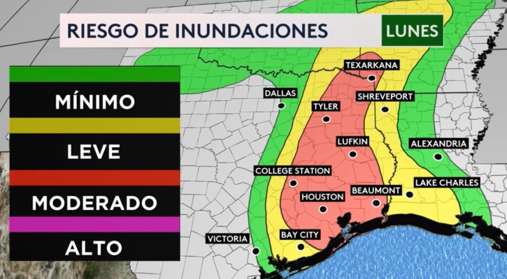 •Riesgo de inundaciones hoy se expandirá al norte desde la costa de Texas tan al norte como Arkansas mientras que Beryl siga su trayectoria al noreste. Las ciudades bajo un riesgo moderado (nivel 3 de 4 en la escala de inundaciones en la sombra roja) son Houston, College Station, Beaumont, Lufkin, Tyler y Texarkana. Se esperan hasta 12” de lluvia durante las próximas 24 horas y hasta 15” aisladas