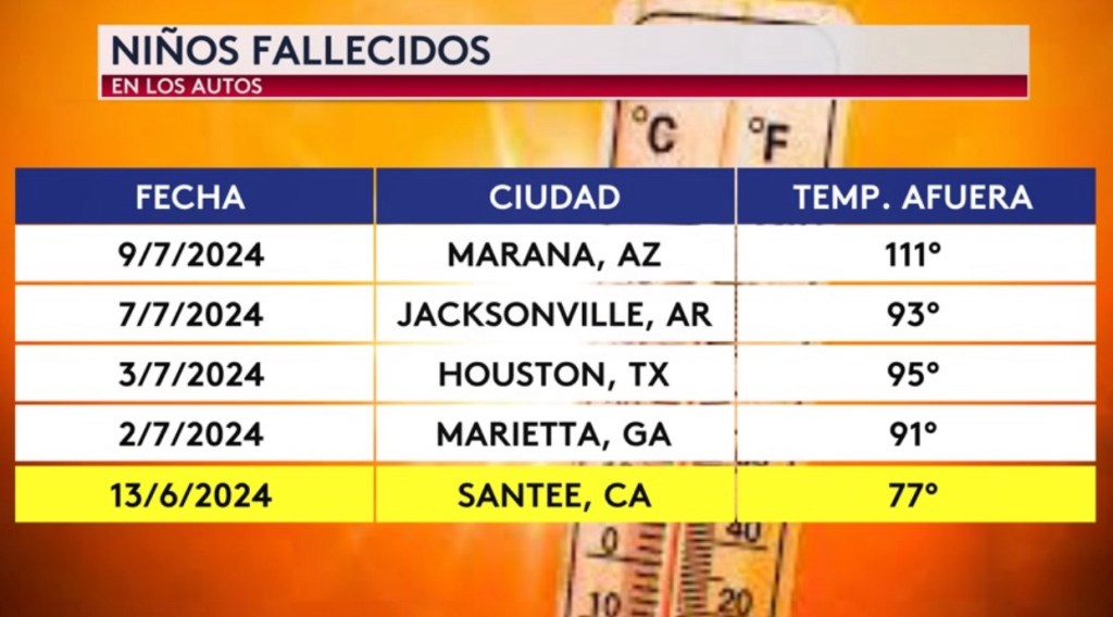 •Los 5 casos más recientes de niños fallecidos en los autos. Ayer mismo se murió una niña de 2 años en un auto en la ciudad de Marana, Arizona donde había un temperatura afuera de 111°. Pero el 13 de junio se murió una niña de 2 meses de edad en la ciudad de Santee, California donde la temperatura afuera “solo” estaba en los 77°