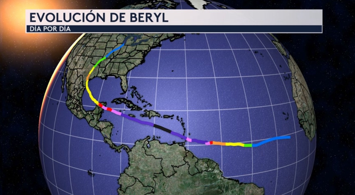 •La trayectoria completa de Beryl: que tomó alrededor de 2 semanas en salir de la costa de Africa como onda tropical hasta llegar a tocar tierra en Texas en los Estados Unidos.