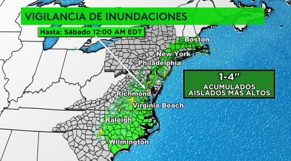 •Hay una vigilancia de inundaciones hasta la medianoche para la costa este del país desde Carolina del Sur hasta Massachussets debido a las fuertes lluvias que pudieran producir acumulados de 1-4” y más en áreas aisladas. Esta vigilancia incluye las ciudades de Wilmington, Raleigh, Virginia Beach, Richmond, Philadelphia, Nueva York y Boston