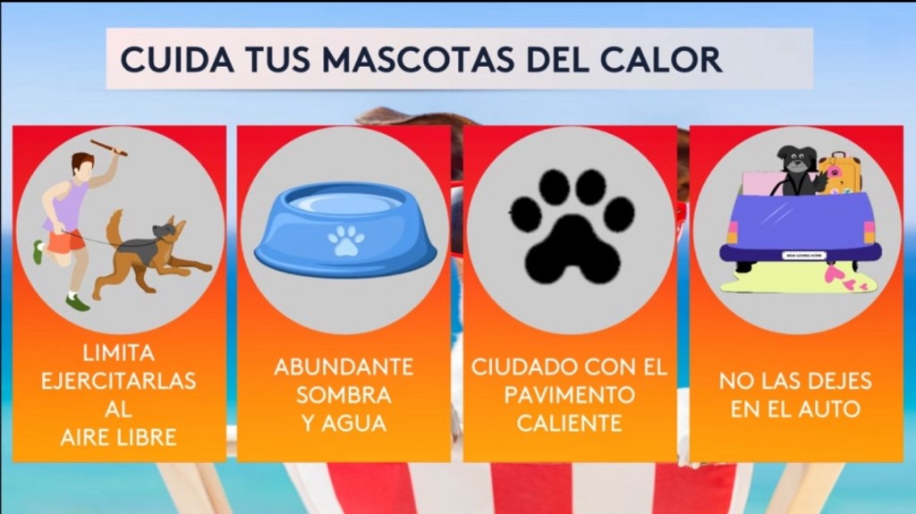 •Además de los seres humanos, también se tienen que cuidar las mascotas del calor. Se debe limitar ejercicio al aire libre, darles bastante agua y sombra, cuidarles y vigilarles las patitas con el pavimento caliente y no dejarlos en el auto