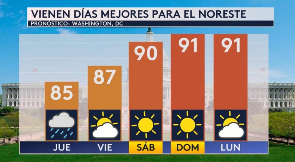 •Estará lloviendo hasta el fin de semana en Texas, pero la historia es distinta para el noreste del país donde hoy será el último día con lluvia para ciudades como Washington, DC. Se esperan condiciones más secas y menos agobiantes con respecto al calor este fin de semana tras el paso de un frente frío