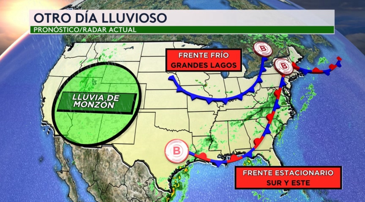 •Va ser otro día lluvioso para el sur y este del país debido a la presencia de un par de frentes y para el suroeste debido a las lluvias de monzón. Ciudades que estarán bajo riesgo de inundaciones en el suroeste hoy: Phoenix, Albuquerque, Salt Lake City y Grand Junction. Desde Texas hasta Nueva Jersey: San Antonio, Austin, New Orleans, Memphis, Nashville, Atlanta y Washington serán algunas ciudades bajo un riesgo mínimo. Ciudades como Houston, Corpus Christi, Jackson, Columbia y Raleigh estarán bajo un riesgo moderado (sombra amarilla). Ciudades a lo largo de la costa de Texas y Louisiana como Beaumont, Victoria, Bay City, Galveston y Lake Charles estarán bajo un riesgo alto (nivel 3 de 4 en la escala de inundaciones/sombra roja)