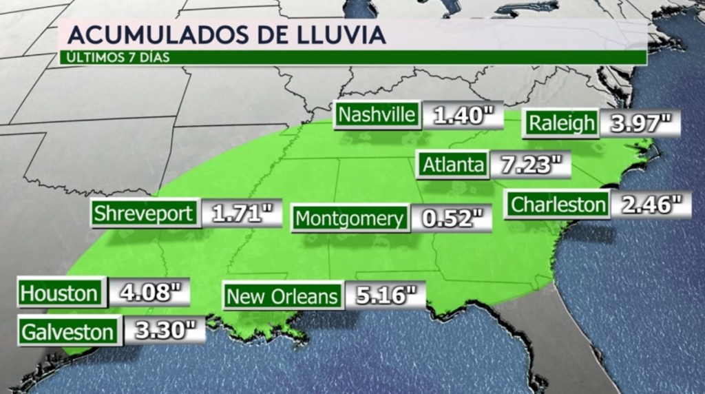 •Fue una semana lluviosa para el sureste del país. Los acumulados de lluvia de los últimos 7 días están mostrados, donde Atlanta, New Orleans y Houston recibiendo las mayores cantidades
