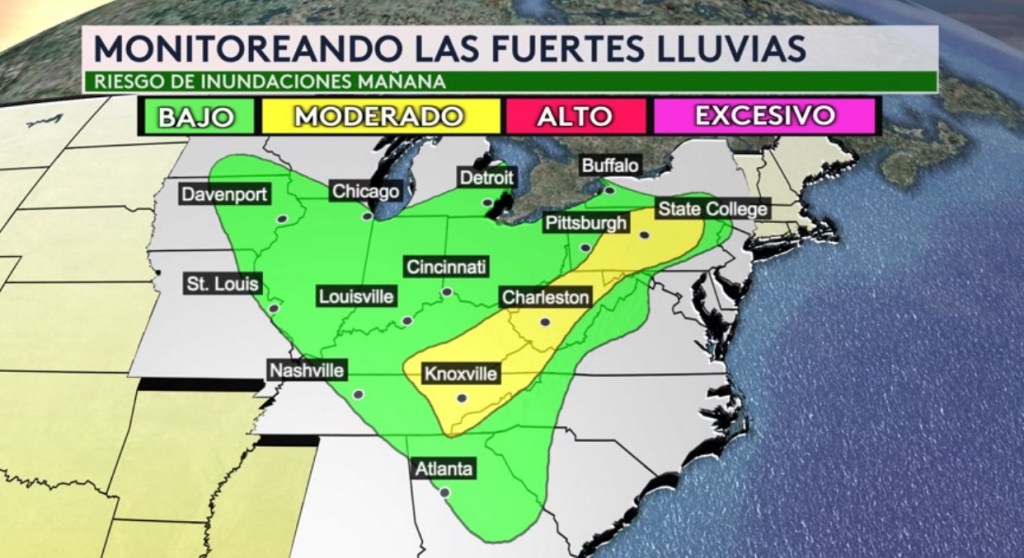 •Un nuevo sistema frontal estará trayendo el riesgo de inundaciones desde los Grandes Lagos hasta el sureste hoy (ciudades como Atlanta, Knoxville y Cincinnati estarán bajo un mayor riesgo en la sombra amarilla) y más hacia el este mañana con ciudades como Knoxville, Charleston y State College bajo un riesgo moderado en la sombra amarilla