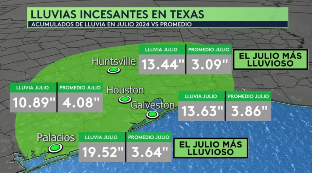 •¡Lluvias incesantes para Texas este mes con los acumulados en ciudades como Houston, Galveston, Huntsville y Palacios superando sus promedios de julio por varias pulgadas! Con 3 días faltando en el mes, Huntsville y Palacios ya han experimentado el julio más lluvioso