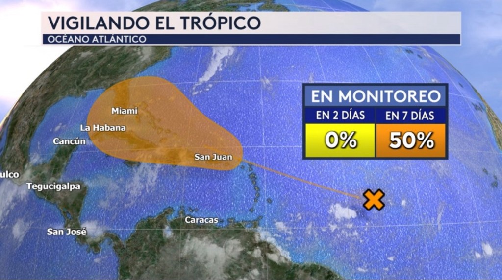 •Estamos vigilando un disturbio ubicado sobre el Atlántico tropical, lo cual tiene un 50 % de probabilidad de desarollo tropical a partir del boletín de las 8:00 AM del Centro Nacional de Huracanes. El sistema se dirigirá al oeste-noroeste hacia las Antillas Mayores (Puerto Rico, Las Bahamas, Cuba) y posiblemente el sureste de los Estados Unidos para finales de semana y el fin de semana. El sistema no se ha formado, entonces los posibles peligros todavía no se conocen. Seguiremos vigilando