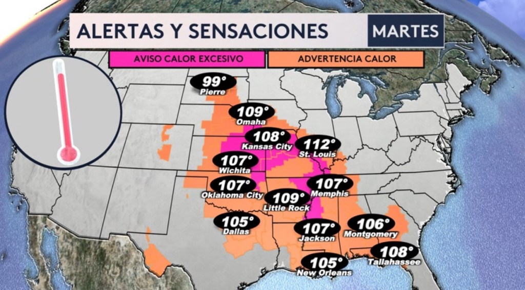 •Todo debido a un domo de calor, que se irá desplazando al este durante los próximos días. Estás localidades más al este empezarán a sentir ese ascenso en las temperaturas a partir de mañana donde ciudades como Atlanta, Nashville, Jackson, Raleigh y Washington estarán en los medios an altos 90°. Ciudades como Kansas City y Garden City recibirán un alivio el jueves mientras que Oklahoma City y Dallas se mantienen en los altos 90° y tres dígitos