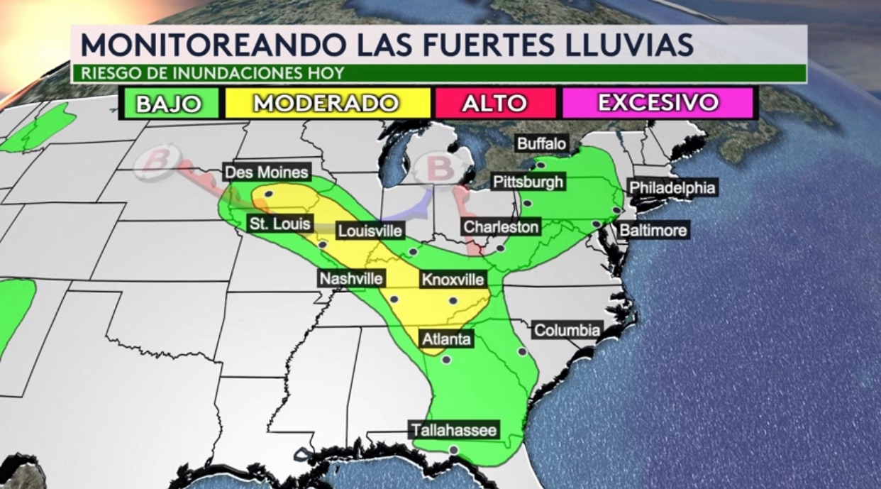•Seguimos monitoreando las fuertes lluvias para el este del país. Habrá un par de sistemas frontales que traerán un riesgo de inundaciones hoy para el Medio Oeste extendiendo hacia el sureste y noreste y mañana para el Medio Oeste superior, Grandes Lagos, Valle de Ohio, los Apalaches y Nueva Inglaterra. Ciudades bajo un mayor riesgo (sombra amarillo) hoy son Des Moines, St. Louis, Nashville y Knoxville. Para mañana: las ciudades de Minneapolis, Sioux Falls, Des Moines, Chicago, y Concord están bajo un riesgo moderado