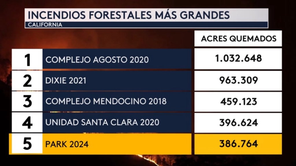 •Seguimos monitoreando el Incendio Park en el norte de California al noreste de la ciudad de Chico, que ahora ocupa el quinto lugar de los incendios forestales más grandes en la historia de California, superando recientemente el Incendio Creek del 2020. Ha quemado 386.764 acres a partir de esta mañana