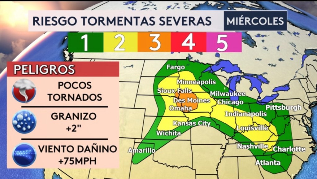 •También estaremos vigilando el riesgo de tormentas severas desde el Medio Oeste Superior hasta los Apalaches. El mayor riesgo del día se encuentra en la sombra naranja que incluye las ciudades de Des Moines en Iowa, Sioux Falls en Dakota del Sur y Omaha en Nebraska. Las amenazas principales para esta zona y ciudades alrededores serán granizo de más de 2” en diámetro y vientos significativos de más de 75 mph. Algunos tornados, granizo de más de 1” en diámetro y vientos dañinos de más de 58 mph son posibles para las demás ciudades bajo riesgo