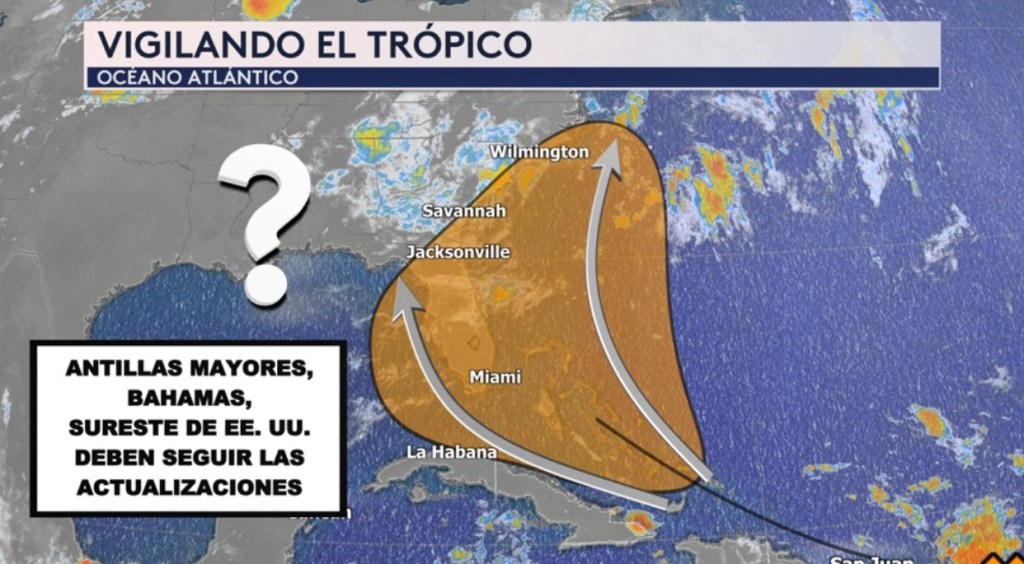 •Una onda tropical ubicada al este de los Antillas Menores tiene un 60 % de probabilidad de desarollo ciclónico este fin de semana cuando se acerque a las Bahamas. La zona en la sombra naranja es donde el Centro Nacional de Huracanes predice que el sistema se pueda convertir en ciclón tropical durante los próximos 7 días. Cuando el disturbio llegue alrededor de las Bahamas, hay incertidumbre en los modelos de pronóstico de su trayectoria. Algunos lo dirigen al noreste fuera de la costa de Florida y posible impactando las Carolinas mientras que otros lo dirigen más al oeste hacia el Golfo de México. Por eso el sureste de los Estados Unidos, las Bahamas y Cuba deben vigilar el progreso del sistema