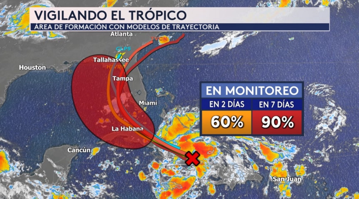 •Seguimos vigilando un disturbio ubicado sobre el este de Cuba y oeste de La Española, actualmente trayendo fuertes lluvias para la Española, Cuba, Jamaica y las Bahamas. Hay una alta probabilidad de que ese sistema se forme en una depresión tropical este fin de semana en el este del Golfo de México. Las modelos de trayectoria sugieren una trayectoria al este de la zona de formación (sombra roja) más cercana a la costa oeste de Florida.