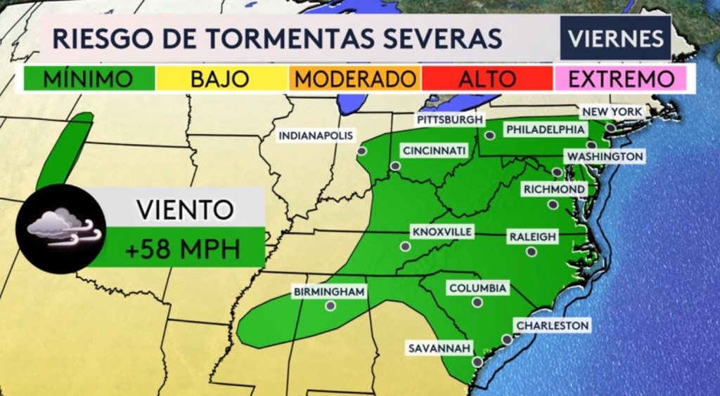 •Hay riesgo de tormentas severas para el este del país hoy y mañana con viento dañino siendo la amenaza principal debido a ese mismo frente frío que estará trayendo un alivio de las sensaciones agobiantes