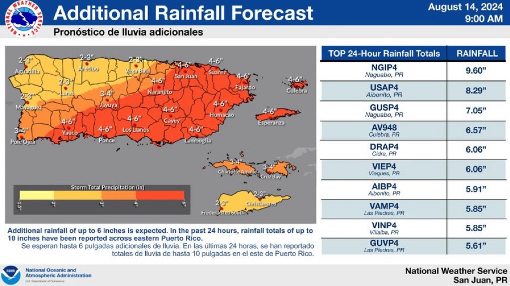 •Han caído hasta 9” de lluvia en partes de Puerto Rico en las últimas 24 horas en ciudades como Naguabo y alrededor de 6” en Culebra y Vieques. Según el Servicio Meteorológico Nacional de San Juan en Puerto Rico, todavía se pronostican acumulados de lluvia de hasta 6” adicionales, especialmente para el sureste de Puerto Rico (ciudades como Ponce, Humacao, Fajardo y San Juan) que también incluye Culebra y Vieques