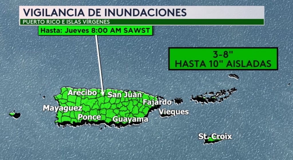 •La vigilancia de inundaciones para Puerto Rico y las Islas Vírgenes sigue en vigor hasta el jueves por la mañana. En total, se esperan 3-8” de lluvia con acumulados aislados de hasta 10”