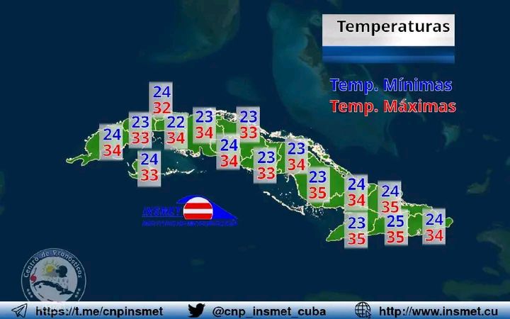 •Las temperaturas máximas estarán entre 32 y 35 grados Celsius, superiores en zonas del interior. En la noche, las temperaturas alcanzarán valores entre 25 y 28 grados Celsius.