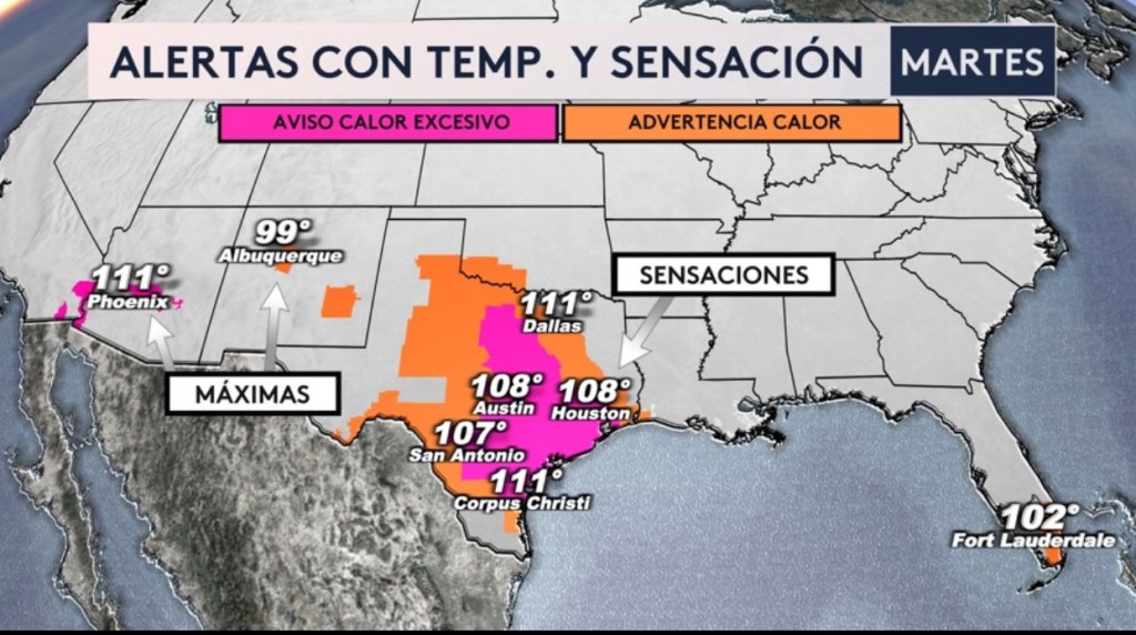 •La historia es distinta al sur del país donde el calor excesivo estará afectando ciudades como Phoenix, Houston, Dallas, San Antonio y Miami. Hay advertencias por calor y avisos por calor excesivo en vigor debido a las sensaciones térmicas de tres dígitos desde Texas hasta el sur de la Florida y a las máximas de tres dígitos para Nuevo México y Arizona