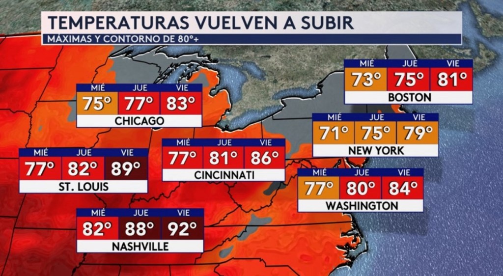 •Disfruten estás condiciones placenteras ya que se espera que estás temperaturas vuelvan a subir para finales de semana para ciudades como Nueva York, Boston, Washington, Nashville y Chicago