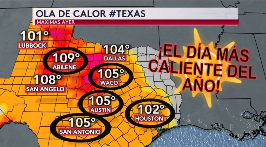 •¡Las ciudades de Houston, Waco, Austin, San Antonio y Abilene en Texas experimentaron el día más caliente del año ayer! Máximas ayer tuvieron en los tres dígitos para gran parte del estado