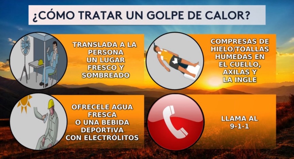 •Si ves a alguien sufriendo de un golpe de calor (los síntomas son náuseas, fatiga, confusión, sudoraciones, calambres y inflamación); lleva la persona a un lugar fresco bajo sombra; ofrécele agua o una bebida deportiva con electrólitos; aplícale compresas de huelo o toallas húmedads en el cuello, axilas y la ingle; y si la persona no responde llama al 9-1–1