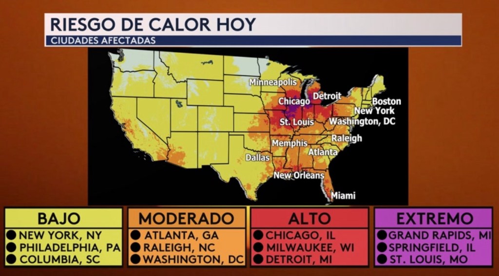 •El Centro de Control de Enfermedades y el Servicio Nacional Meteorológico han creado esta escala de riesgo de calor, donde han recolectados varios datos climatológicos e históricos que ayudan a determinar el peligro que representa las temperaturas altas en el cuerpo y la salud. La escala va desde un riesgo bajo a extremo, y hoy las ciudades de Grand Rapids en Michigan, Springfield en Illinois y St. Louis en Missouri están bajo ese nivel más alto (color morado). Bajo un riesgo alto (color rojo) están Chicago, Milwaukee y Detroit