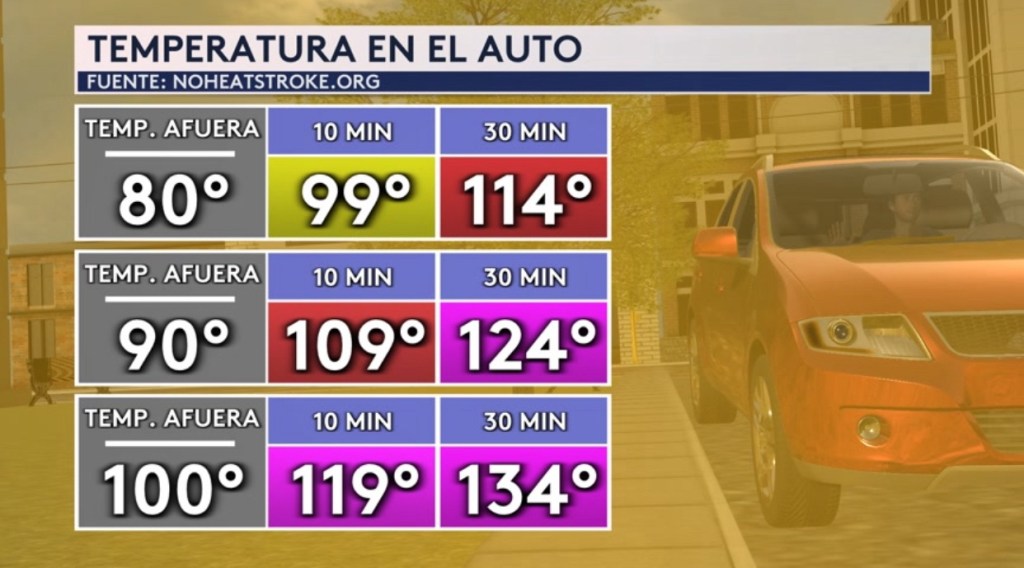 •Nunca debes dejar a nadie dentro de un auto caliente. Las temperaturas pueden subir a niveles extremadamente peligrosos en muy poco tiempo. ¡Con una temperatura máxima en los 90° y 100°, igual a lo que estamos viendo hoy para muchas ciudades, el auto pudiera llegar a los 124° y 134° en solo 30 minutos, respectivamente! Ya hemos visto 27 niños perder la vida por ser dejado/olvidado en el auto este año. ¡Estás muertes pueden ser prevenidas!