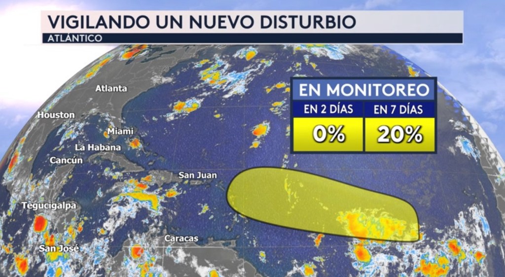 •En el Atlántico, estamos vigilando un nuevo disturbio, lo cual tiene un 20 % de probabilidad de convertirse en ciclón tropical el domingo o lunes del fin de semana festivo