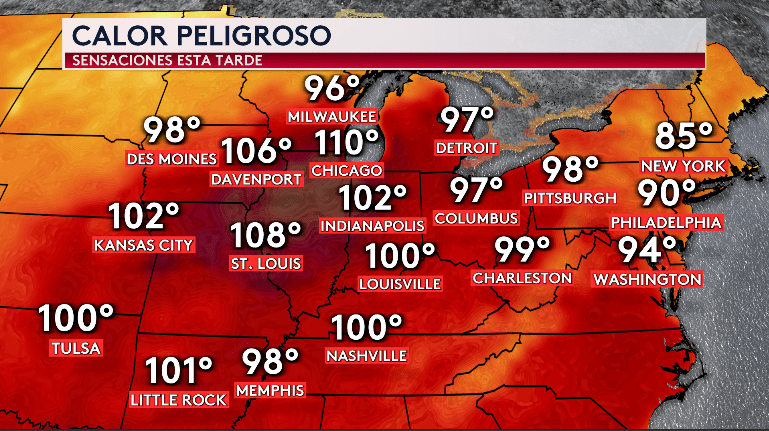 •Máximas y sensaciones hoy. Este calor peligroso ocupará el Medio Oeste, Grandes Lagos, Medio Atlántico y tan al sur como el Valle de Tennessee. ¡La máxima hoy en Chicago estará en los 98° con una sensación térmica de 110°, el día más caliente en lo que va del año para ellos! Se sentirá como los 108° en St. Louis, 102° en Indianápolis y Kansas City, 90° en Philadelphia y 94° en Washington