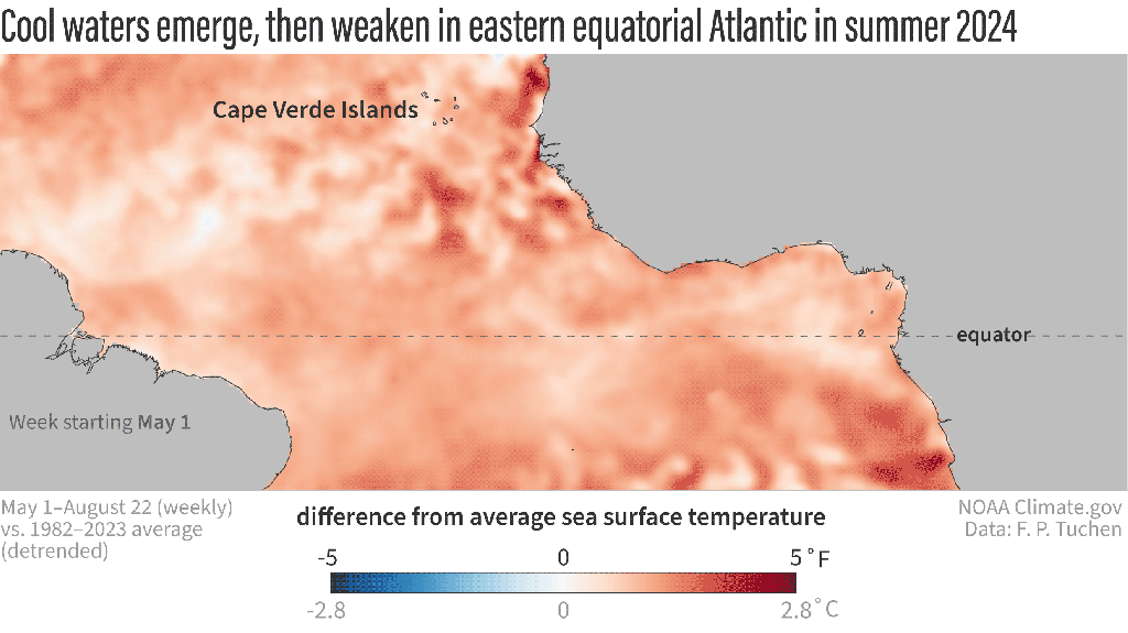 •2- El enfriamiento localizado que dominó la región del Atlántico Niña/Niño en junio-julio parece estar debilitándose. Justamente con la NOAA informó en su primera publicación, las temperaturas de la superficie del mar en el Atlántico ecuatorial oriental siguen un ciclo estacional contrario a la intuición. La región se calienta durante la primavera, pero luego se enfría en el verano gracias a los patrones de viento que impulsan el afloramiento de agua profunda y fría. En junio y julio este típico enfriamiento fue más intenso de lo habitual. Desde entonces, sin embargo, el enfriamiento se ha debilitado, como se puede ver en esta animación de las temperaturas semanales de la superficie del mar en comparación con el promedio.