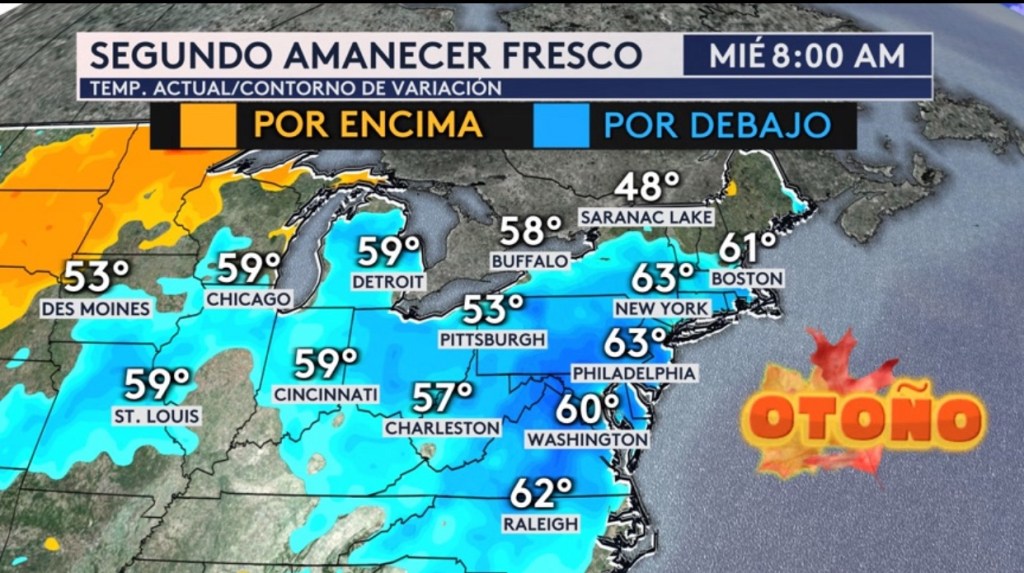 •Después de un ligero ascenso en las temperaturas mínimas mañana y viernes, volverán a caer las temperaturas tras paso de otro frente frío, esta vez más fuerte, para el fin de semana. Chicago, Detroit y Louisville estarán en los 40°, Nueva York, Washington, Memphis y Atlanta en los 50° y llegando tan al sur como New Orleans y Dallas donde estarán amaneciendo con temperaturas en los 70° y 60°, respectivamente
