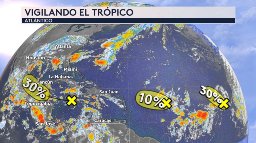 •Seguimos vigilando 3 ondas tropicales en el Atlántico para el posible desarrollo ciclónico. Todos tienen bajas probabilidades de formarse con las dos ubicadas en el Atlántico tropical no representando un peligro a tierra y la onda en el Mar Caribe probablemente trayendo fuertes lluvias y vientos para la Península de Yucatán y Centroamérica el viernes y sábado independientemente de su desarrollo