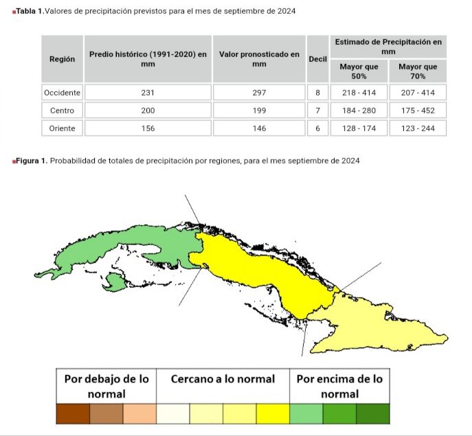 •En septiembre se mantienen las condiciones de intenso calor propias del verano en Cuba, aunque la temperatura desciende ligeramente con respecto a agosto. Los altos valores de humedad relativa y el predominio de vientos débiles en la mayor parte del territorio nacional conllevan a la persistencia de sensaciones calurosas y muy calurosas en el ser humano. Basado en la salida de los modelos consultados y el criterio de los expertos, para el actual septiembre se prevén temperaturas máximas por encima de la media histórica en las tres regiones del país y mínimas en el límite superior de la norma para Occidente y por encima de lo normal en Centro y Oriente (tabla 2).