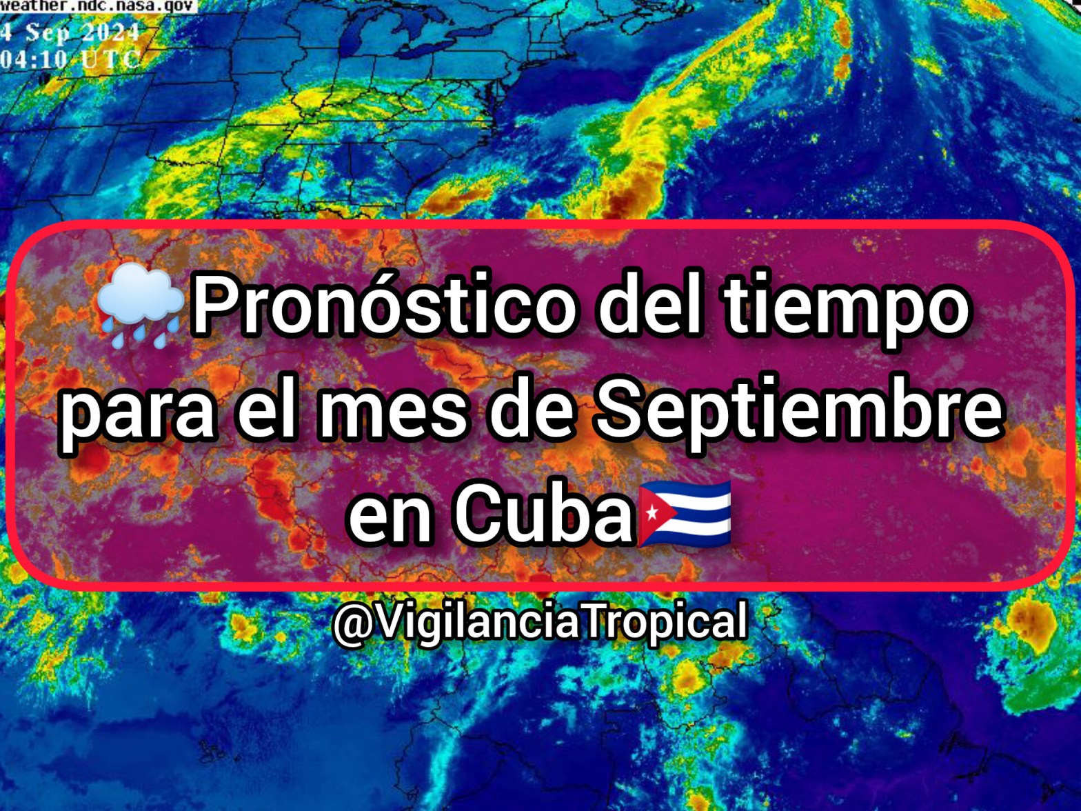 •Septiembre es uno de los meses más lluviosos en Cuba. La influencia del anticiclón del Atlántico disminuye considerablemente con respecto a julio y agosto, lo que, unido al paso frecuente de las ondas y las bajas tropicales, propicia el incremento de las precipitaciones. La frecuencia de formación de ciclones tropicales en nuestra región también se incrementa durante este mes, por lo que aumenta de forma notable la actividad ciclónica sobre Cuba con respecto a agosto, aunque la frecuencia de los huracanes que la afectan en dicho mes es algo inferior a octubre. Asociados a la influencia directa o indirecta de los ciclones tropicales, suelen ocurrir eventos de grandes precipitaciones.