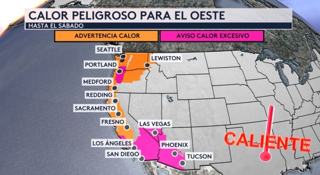 •Calor peligroso para el oeste del país hoy con alertas en vigor desde Washington hasta Arizona. Ciudades como Los Angeles, Las Vegas, Phoenix y Portland están bajo avisos por calor excesivo y San Diego, Sacramento, Fresno y Seattle bajo una advertencia por calor