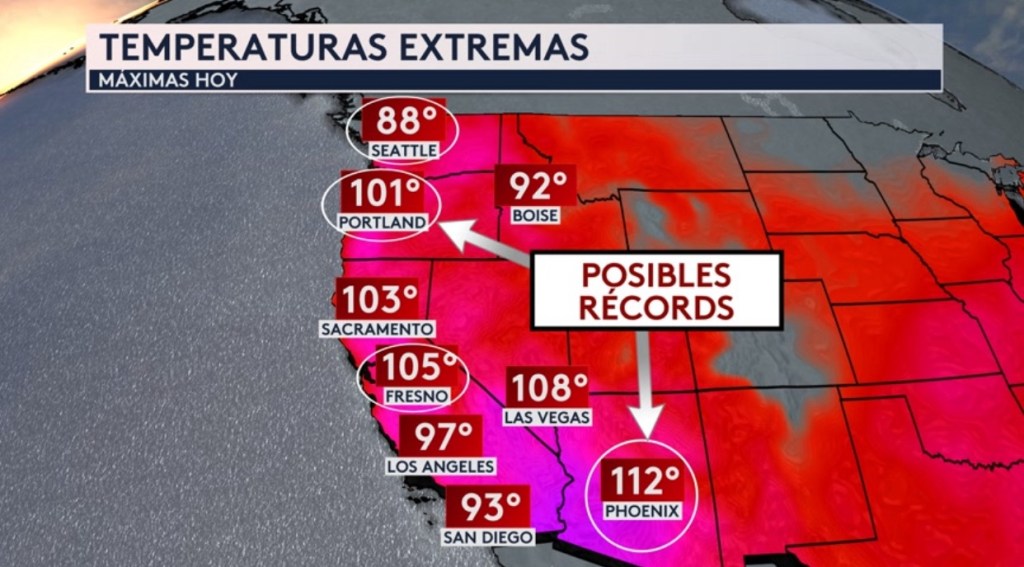 •Temperatures máximas calientes hoy. 112° en Phoenix, 108° en Las Vegas, 97° en Los Angeles, 93° en San Diego, 101° en Portland y 88° en Seattle. Phoenix, Fresno, Portland y Seattle pudieran batir récords diarios