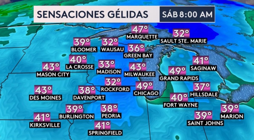 •Pero detrás de este frente se esperan condiciones ventosas, los cuales contribuirán a sensaciones térmicas gélidas en los 30° y 40° para el Medio Oeste y tan al sur como Ohio el sábado por la mañana. ¡Madison en Wisconsin se sentirá como los 33° y Rockford en Illinois y Sault Ste. Marie en la península superior de Michigan como los 32°!