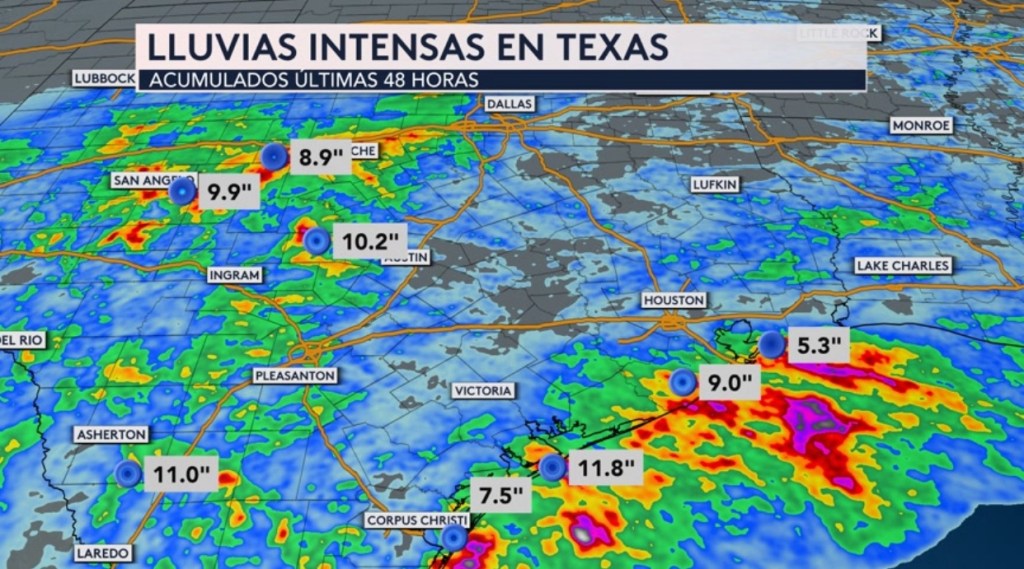 •Se han registrados lluvias intensas en Texas en los últimos 2 días. Han caído casi 10” en la ciudad de San Angelo, 10.2” al noroeste de Austin, 11” al norte de Laredo y casi un pie a lo largo de la costa