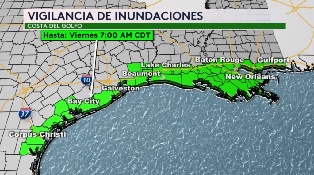 •Debido a las fuertes lluvias que continuarán hoy hacia la costa del Golfo con la presencia de un frente estacionario y una área de baja presión hay una vigilancia por inundaciones desde Corpus Christi en Texas hasta Gulfport en Mississippi hasta el viernes