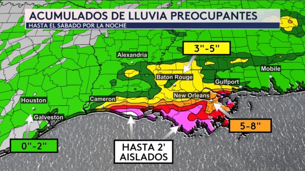 •Los acumulados de lluvia pudieran ser preocupantes hasta el sábado por la noche, especialmente a lo largo de las costas de Louisiana y Mississippi donde pudieran caer hasta un pie. Hasta 2’ son posibles sobre la costa suroeste de Louisiana, entre 5 y 8” en la ciudad de New Orleans y entre 3 y 5” en Baton Rouge