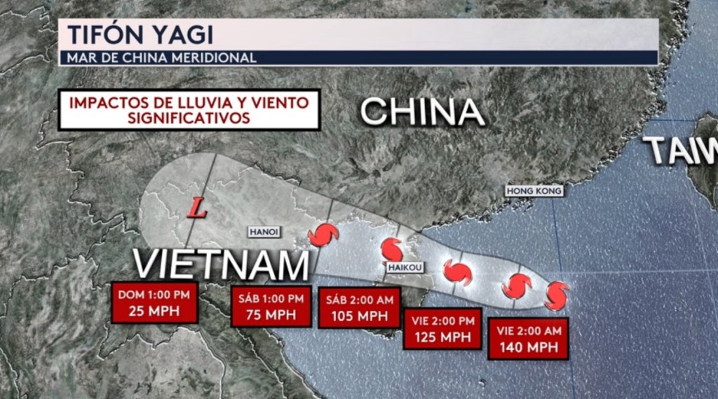 •En el Pacifico Occidental y el Mar de China Meridional, estamos vigilando el Súper Tifón Yagi que actualmente es lo equivalente a un huracán de categoría 4 con vientos máximos sostenidos de 145 mph. Se acercará al sur de China mañana con un potente ciclón tropical y al norte de Vietnam para el fin de semana. Se esperan que los impactos de lluvia y viento sean significativos