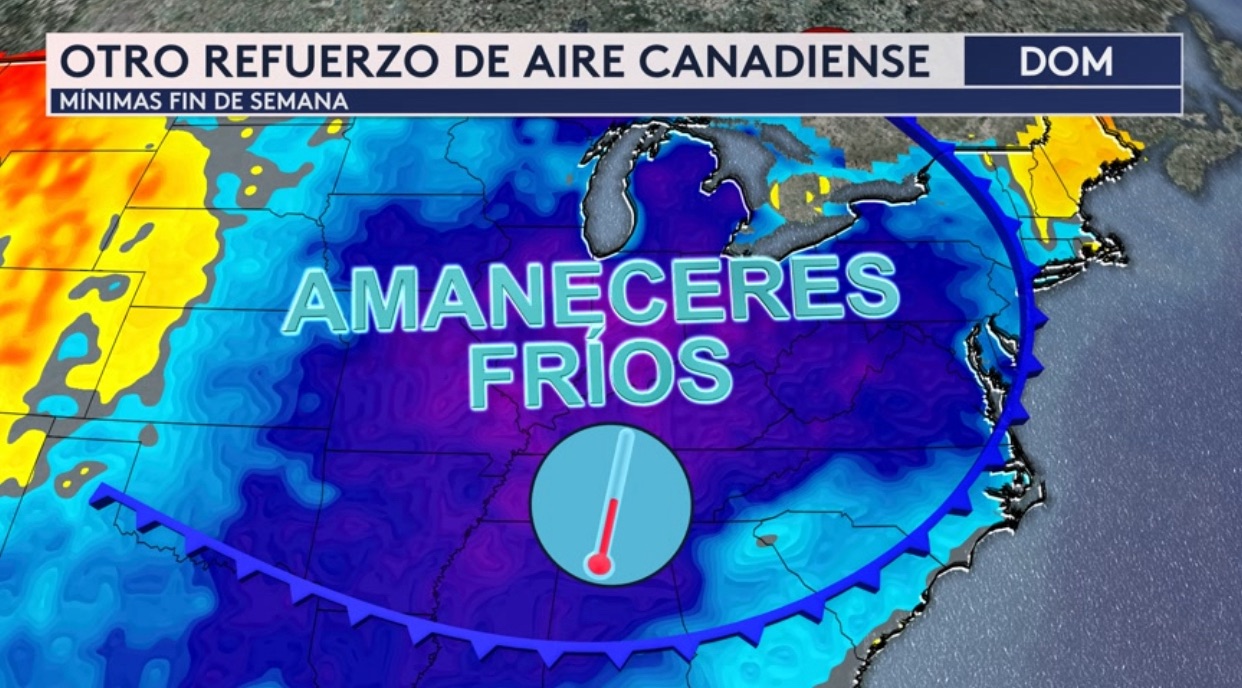 •¡Al este del país, una escenario completamente distinto donde se espera un anticipo de otoño este fin de semana tan al sur como New Orleans! Tras el paso de un frente frío; temperaturas mínimas estarán en los 40° para Chicago, Detroit y Louisville; en los 50° para Nueva York, Washington DC y Memphis; en los 60° para Dallas y Atlanta y en los 70° bajos en New Orleans