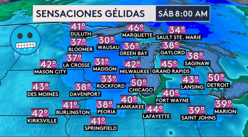 Al amanecer el sábado, ciudades como Milwaukee, Minneapolis y Des Moines experimentarán temperaturas mínimas en los 40° y Detroit, Chicago, Indianápolis y St. Louis en los 50°. Máximas en los 70° para Des Moines, St. Louis y Minneapolis y en los 60° para Chicago, Detroit y Indianapolis.