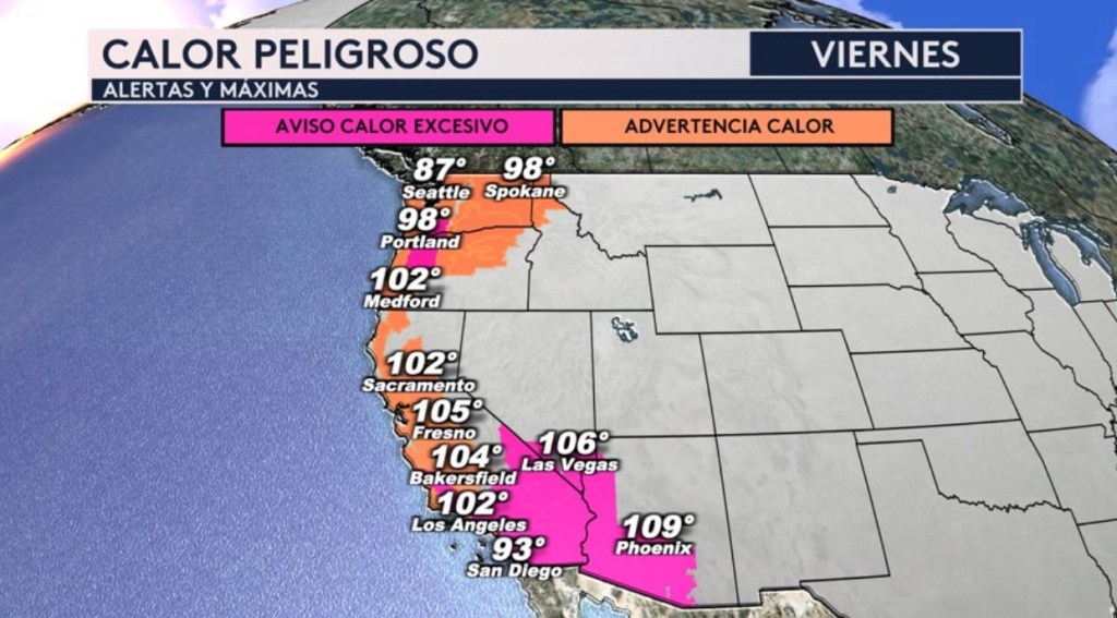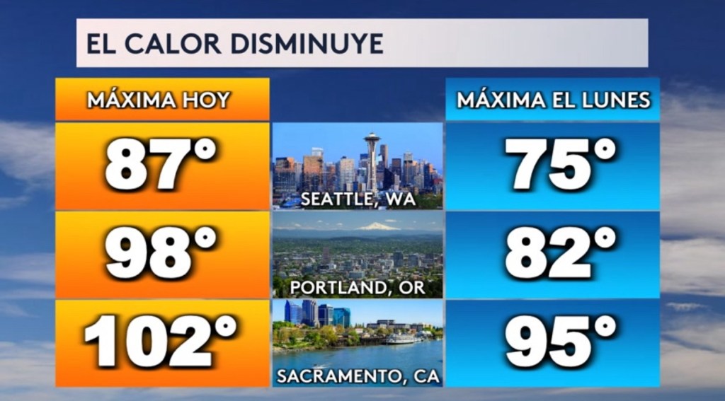 •Pero el calor disminuirá para gran parte del oeste excepto el sur de California. Para hoy ciudades como Seattle, Portland y Sacramento tendrán una máxima de 87°, 98° y 102°; respectivamente. A partir del lunes, las máximas bajarán a 75°, 82° y 95°; respectivamente