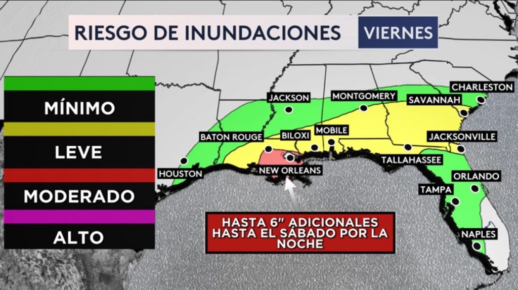 Ciudades como Biloxi, Gulfport, Mobile, Montgomery, Tallahassee, Jacksonville y Savannah están bajo un riesgo leve (sombra amarilla y nivel 2 de 4 en la escala de inundaciones). Pero bajo un riesgo moderado (sombra roja y nivel 3 de 4 en la escala) se encuentra por el segundo día consecutivo la ciudad de New Orleans. Hoy también se encuentra la ciudad de Baton Rouge en este nivel de riesgo. Hasta 6” de lluvia adicionales serán posibles hasta el sábado por la noche para el sureste de Louisiana en esta sombra roja